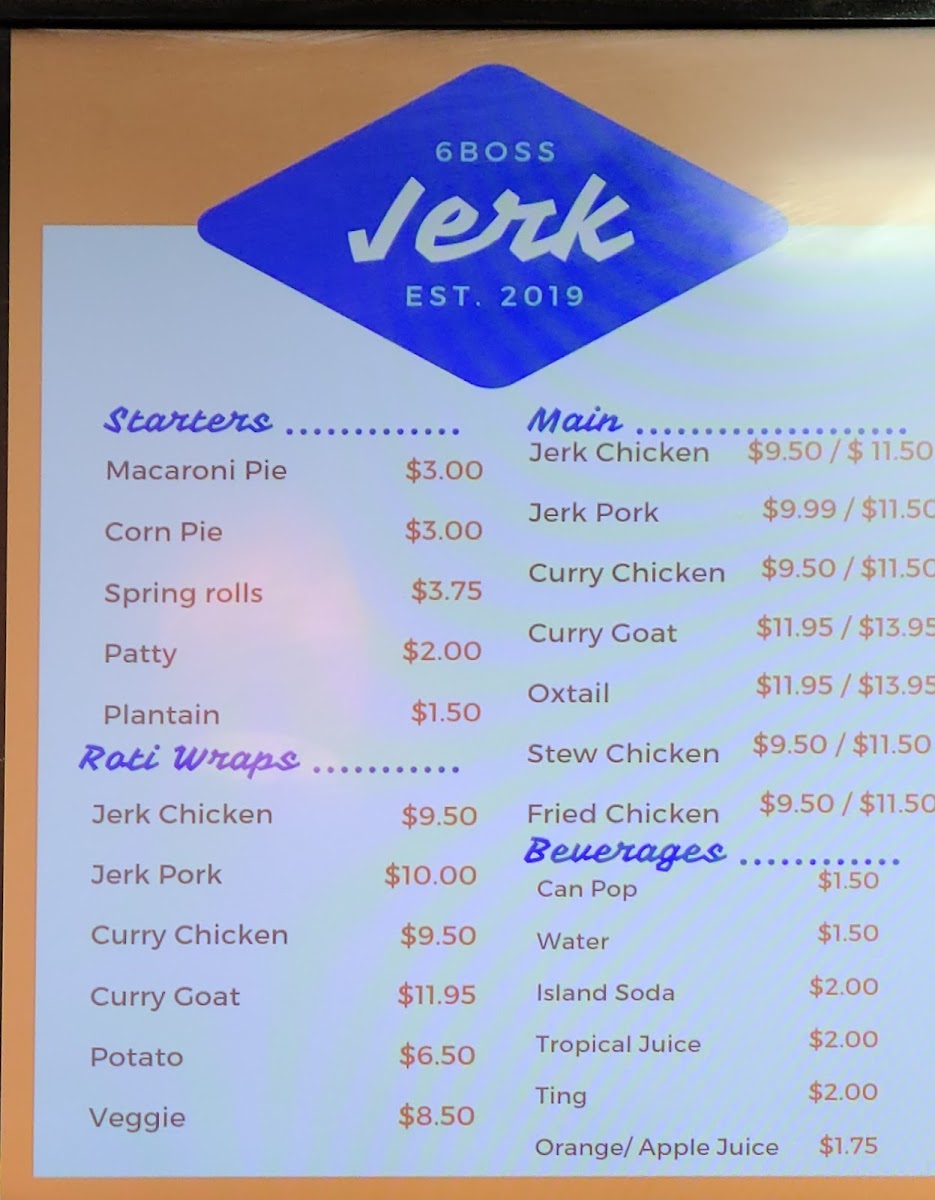 Welcome to 6Boss Caribbean Jerk, a flavorful haven located at 7181 Yonge St #252, Markham, ON. This vibrant eatery captures the essence of Caribbean cuisine, featuring a menu that celebrates spice and flavor. Start your culinary journey with appetizers like Macaroni Pie or Spring Rolls, perfect for sharing. Move on to the heart of the menu with tantalizing main dishes, including the renowned Jerk Chicken and savory Curry Goat, all crafted with authentic spices that ensure each bite bursts with flavor. Customers rave about the unique taste experience, with one noting the delightful kick in the jerk dishes and the generous portions. Don’t miss out on decadent desserts like Red Velvet Cake to round out your meal. 6Boss Caribbean Jerk is not just a meal—it's a flavorful adventure worth savoring!